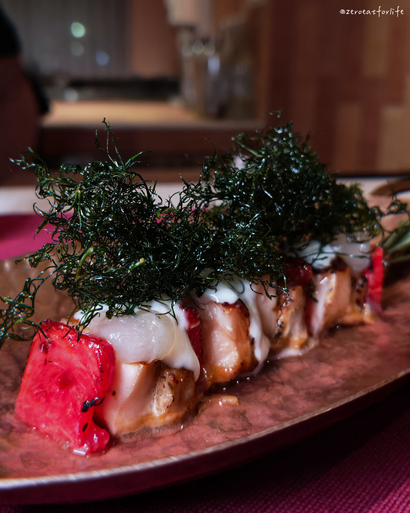 嫩烤雞胸串搭配碳烤西瓜與香料、優格酸甜醬